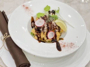白身魚と海老のベニエ バルサミコソースと赤玉葱のヴィネグレット