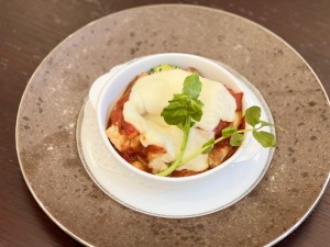 白身魚と海老のベニエ バルサミコソースと赤玉葱のヴィネグレット