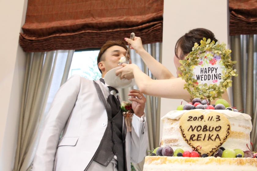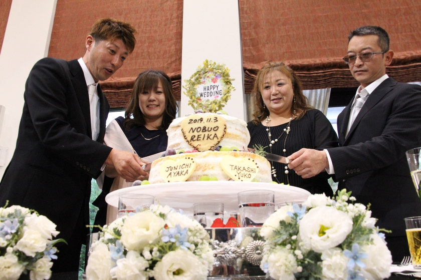 結婚式をしていない姉、兄、夫婦にケーキ入刀、ファーストバイト