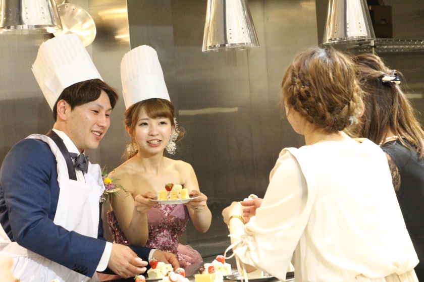 オープンキッチンに入ってのケーキサーブ